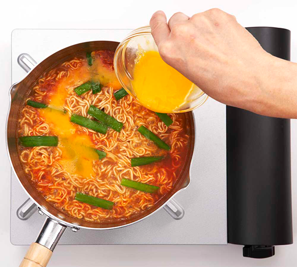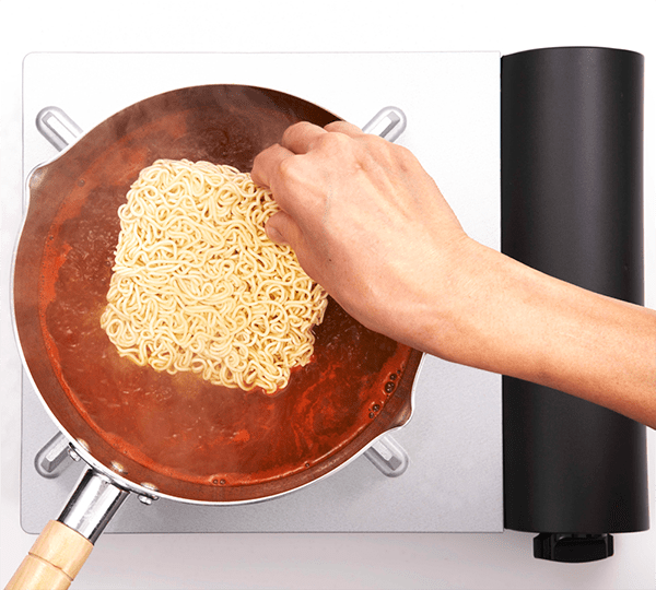 お湯450mlに粉末スープを溶かし、沸とうさせます。めんを入れ、軽くほぐしながら3分間煮込みます。