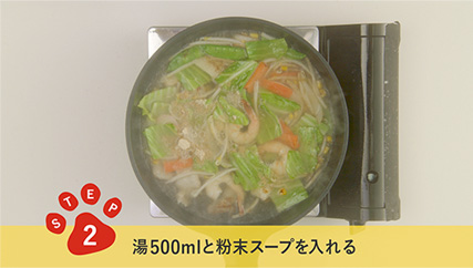 炒め終わったら、お湯500ml(カップ2杯半)を入れ、粉末スープをよくかき混ぜながら溶かして沸とうさせます。