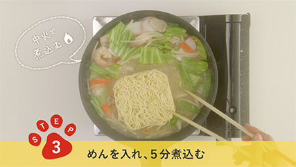 めんを入れて軽くほぐしながら、5分間煮込みます。