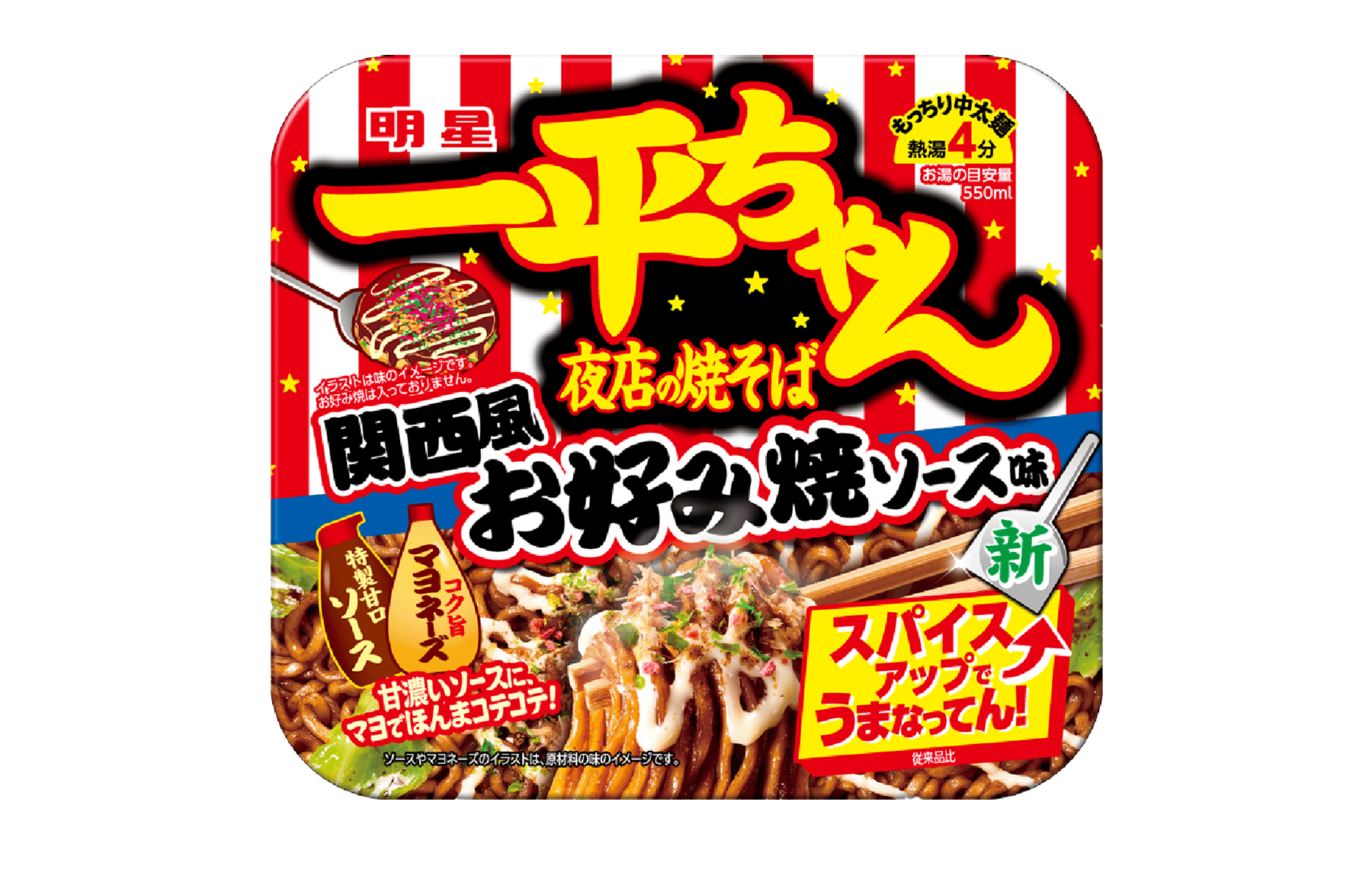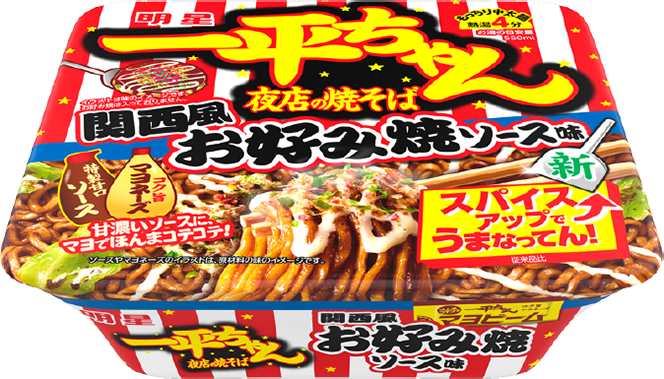 関西風お好み焼ソース味 - オニオンねり込みもっちり中太麺で食べる、甘濃いソースにコク旨マヨネーズでコテコテ、関西の味の一平ちゃんです。具材はキャベツを使用。「紅生姜・削り節・あおさ」を組み合わせたふりかけに新たにスパイスミックスが入り、さらにおいしくなりました。 詳細ページへ