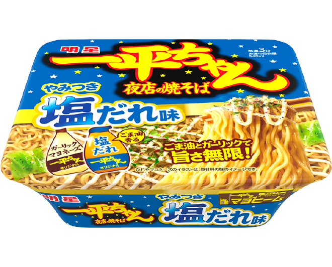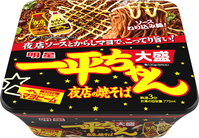 ちゃんオリジナル夜店ソース」に、一平ちゃん夜店の焼そばの特長でもある「一平ちゃんオリジナルからしマヨネーズ」で、こってりとした味わいが楽しめます。麺は通常の1.3倍の130gで、ガッツリ食べたい時には満足感のあるボリュームです。 - 詳細ページへ