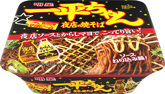ちゃんオリジナル夜店ソース」に、一平ちゃん夜店の焼そばの特長でもある「一平ちゃんオリジナルからしマヨネーズ」で、こってりとした味わいが楽しめます。いっぺん食べたらやめられない味わいをお楽しみください。 - 詳細ページへ