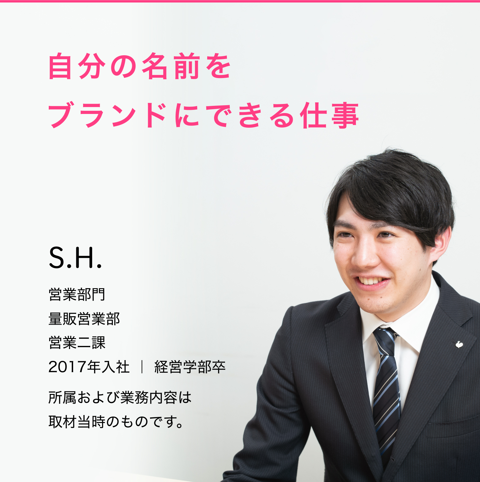 営業のいちばんのやりがいは、「S.H.さんの提案なら」とお得意先様から自分の名前で発注を頂けるところにあると感じます。私たち営業は、明星食品の商品を使ってお得先様の売り上げを拡大できるような施策を提案したり、サポートをします。しかし、明星食品のブランド力だけでは提案を採用してくれなかったり、提案の機会を頂けない場合もあるので、まずは「S.H.」という人間を信頼して頂くことを考えております。