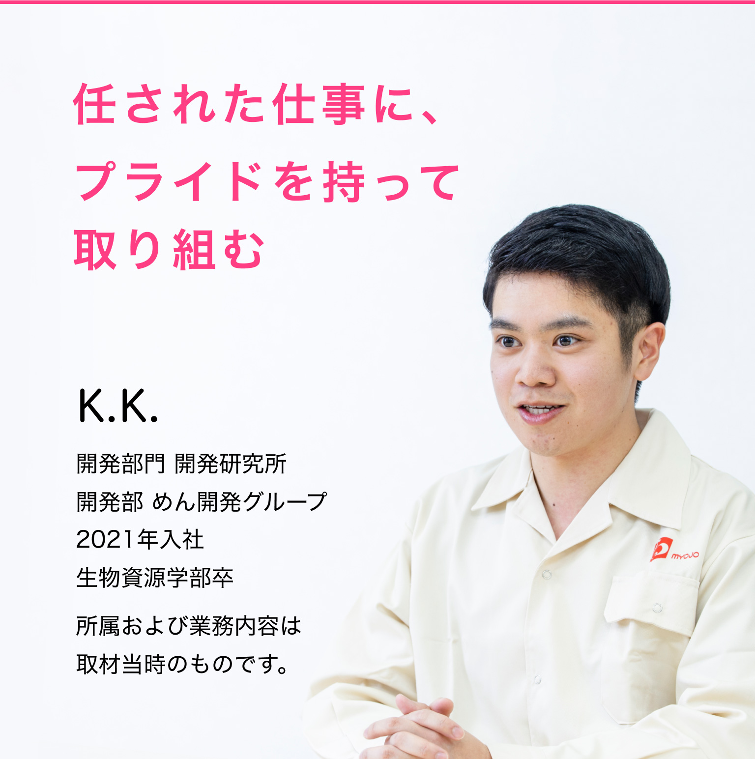 実は明星食品をはじめ、複数社から内定をいただいたのですが、「研究開発職」としての採用は明星食品だけで、他社は総合職としての採用だったんです。総合職採用ですと「研究開発に携わりたい」という自分の希望が叶うかどうかは、配属が決まるまで分かりません。そのため「研究開発職」の採用で決まっていた明星食品への入社を決断しました。