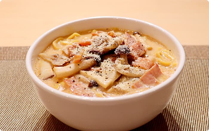 6分後火を止め、粉末スープと液体スープを溶かし、器に盛りつける。仕上げに粉チーズと黒胡椒をかけてできあがり。