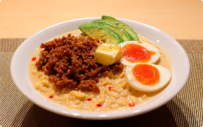 器に移しておいた麺の上にスープをかけて、アボカドと粉チーズをトッピングしてできあがり。