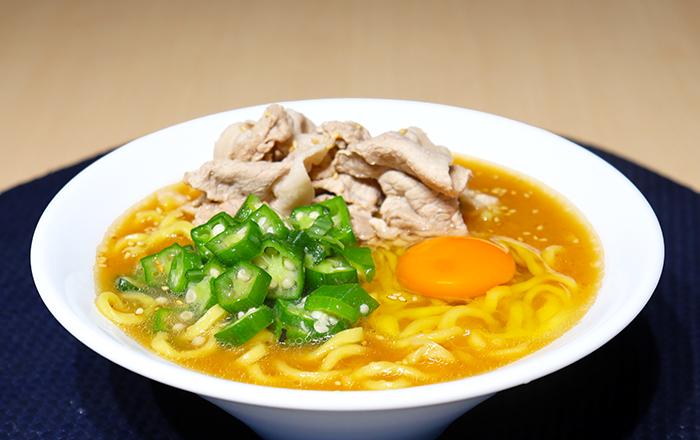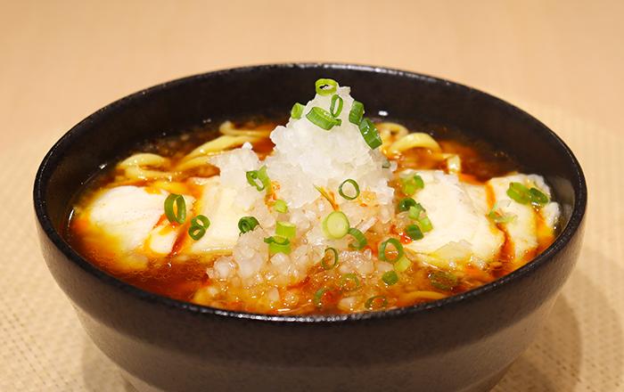 器に移しておいた麺の上にスープをかけて、もずくとおろししょうがをトッピングしてできあがり。