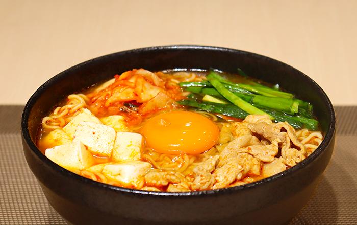 火を止め、器に盛り付け、キムチ、卵をトッピングしたらできあがり。