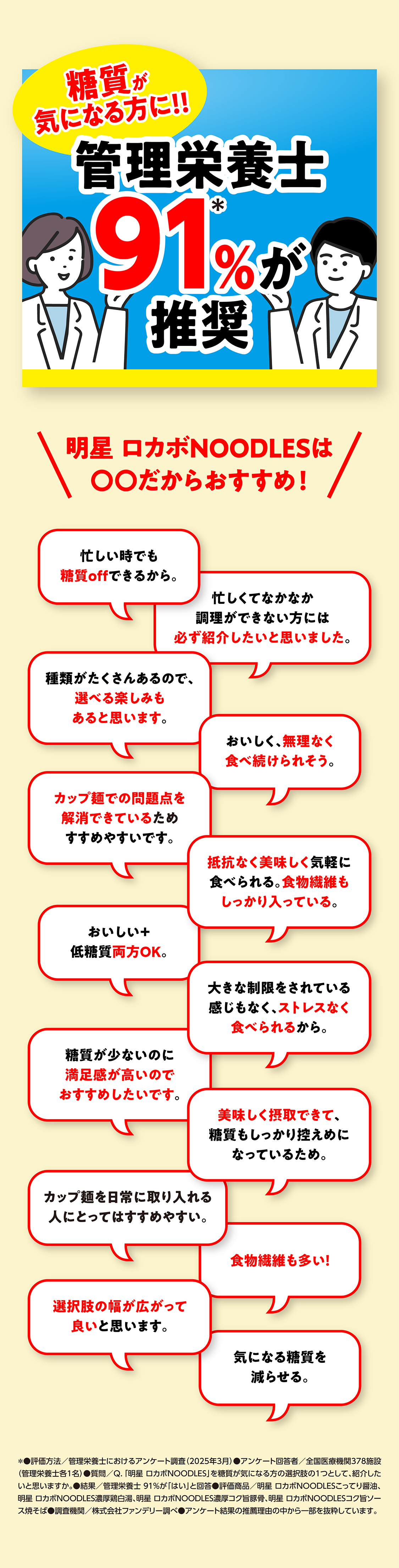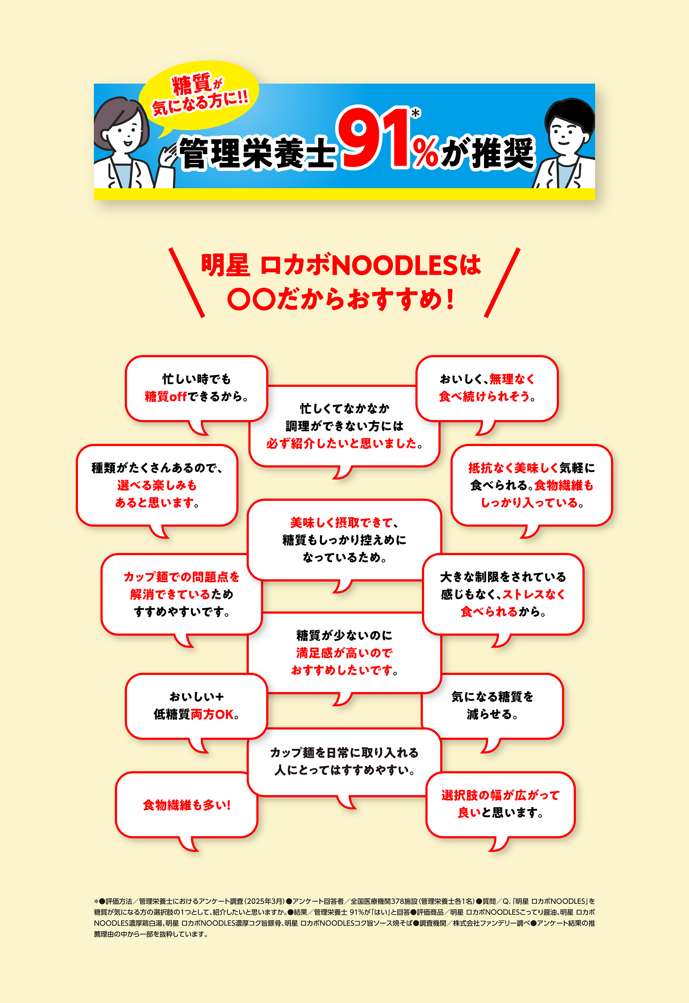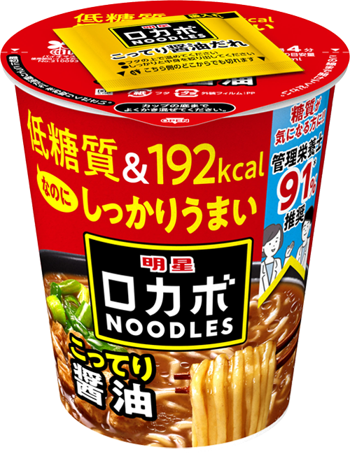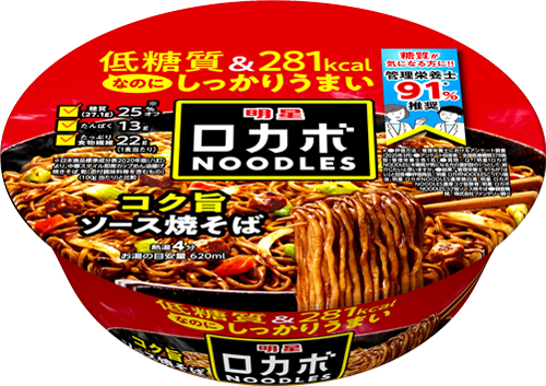 一般的なカップ焼そば※と比較して、「明星 ロカボNOODLES」の焼そばは、糖質が25%オフとなっています。