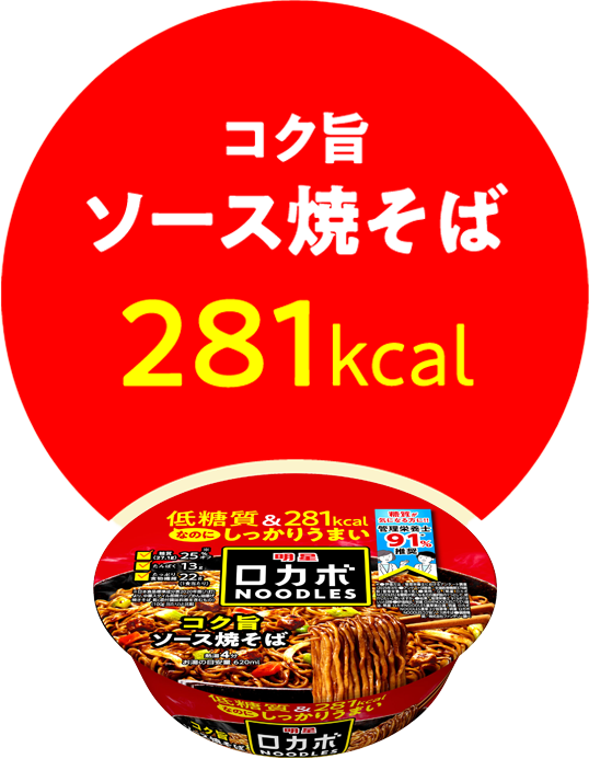 「明星 ロカボNOODLES コク旨ソース焼そば」は、281kcalなのにしっかりおいしい焼そばです。