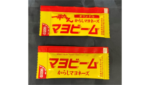 「明星 一平ちゃん夜店の焼そば」に付属する「一平ちゃんオリジナルからしマヨネーズ」。上:包材をアルミレス化したもの、下:従来品